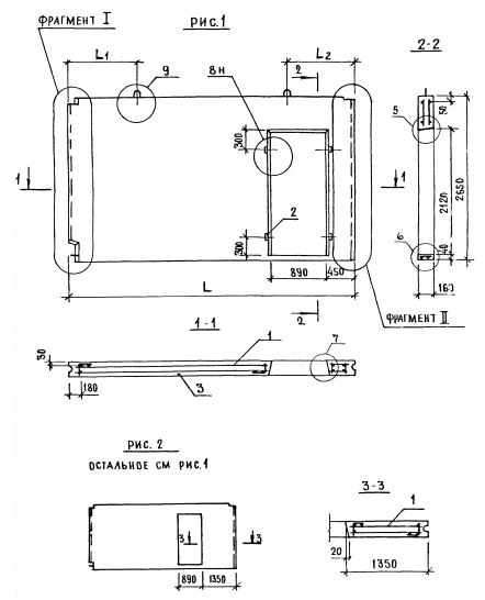 1,2,1,4 - индексы, характеризующие положение панелей в плане здания и их конструктивные особенности ( 1-панели поперечных стен или панели продольных стен, примыкающих к торцу здания; 2 - панель с проемом, 1 - ширина проема 890 мм; 4 - ширина меньшего простенка 1350 мм).